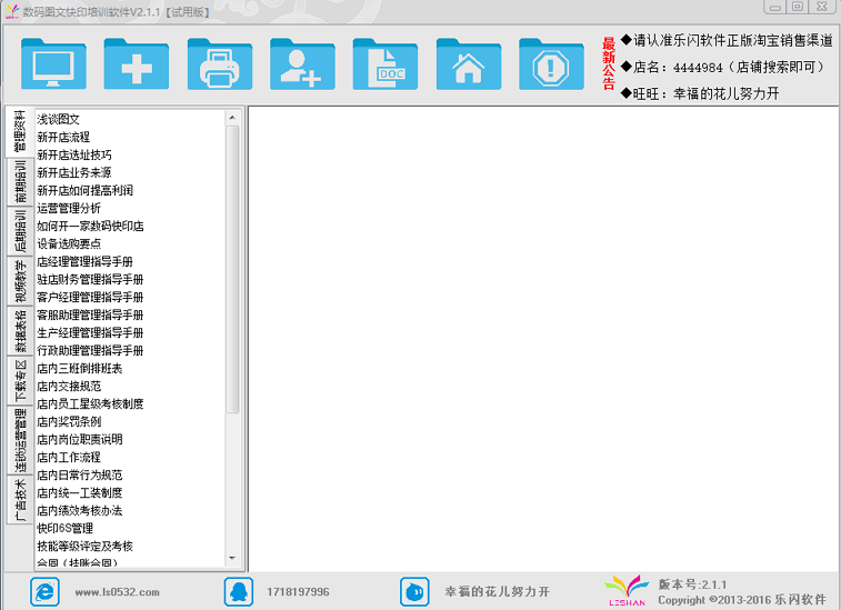 管理资料,前期培训,后期培训,各类视频,机器维修手册,打印常见问题,常用软件下载。每个版块内容都很丰富,管理资料内容居多,都是一些图文店管理类的文件资料,前期注意是一些打印注意时间以及培训项目,后期主要是一些装订样式的认识以及装订注意事项。视频包括软件安装、硬壳精装、蝴蝶装、财务装订的一些视频资料,后期会加入机器维修视频。维修手册是一些常用的维修手册代码,打印常见问题总结了一些常见文件格式的打印项目,常用软件是图文店能用到的所有软件。