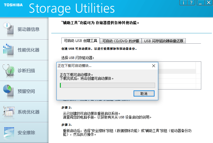 第一次使用这个功能会提示“正在下载可启动模块”,这个过程根据网速不同可能会需要十几分钟,耐心等待吧。记得老版本的东芝Storage Utilities是不用单独下载的,不过那也导致了老工具箱数百兆的体积,而新工具箱现在只要十几兆,下载起来更快,这个辅助工具倒也并不是所有人都会用到的。