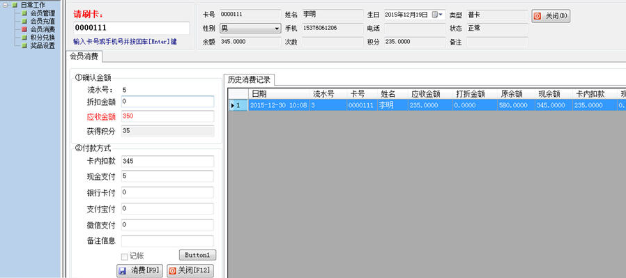通过对会员消费情况进行录入,自动完成累计积分,内设储值卡支付、现金支付、银行卡支付、代金卷、联合支付等五种支付方式。