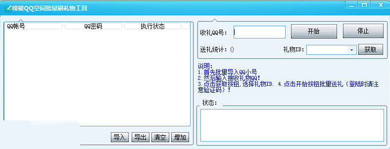 棉被QQ空间批量刷礼物工具,帮助你在QQ空间里快速的向一个人刷礼物,不需要在用手动慢慢的刷啦,有需要的赶紧来东坡下载使用吧。