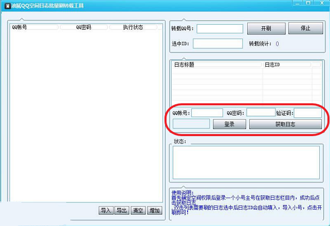 双击列表需要刷的日志选中后日志ID会自动填入,导入小号,点击开刷即可!