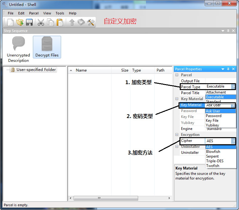 (1)加密类型:Executable 自加密/解密(无需安装解密软件即可解密)、Attachment 附件文件(创建隐藏在其他文件下的加密包)、Standard 标准加密(需要解密软件完成解密)。