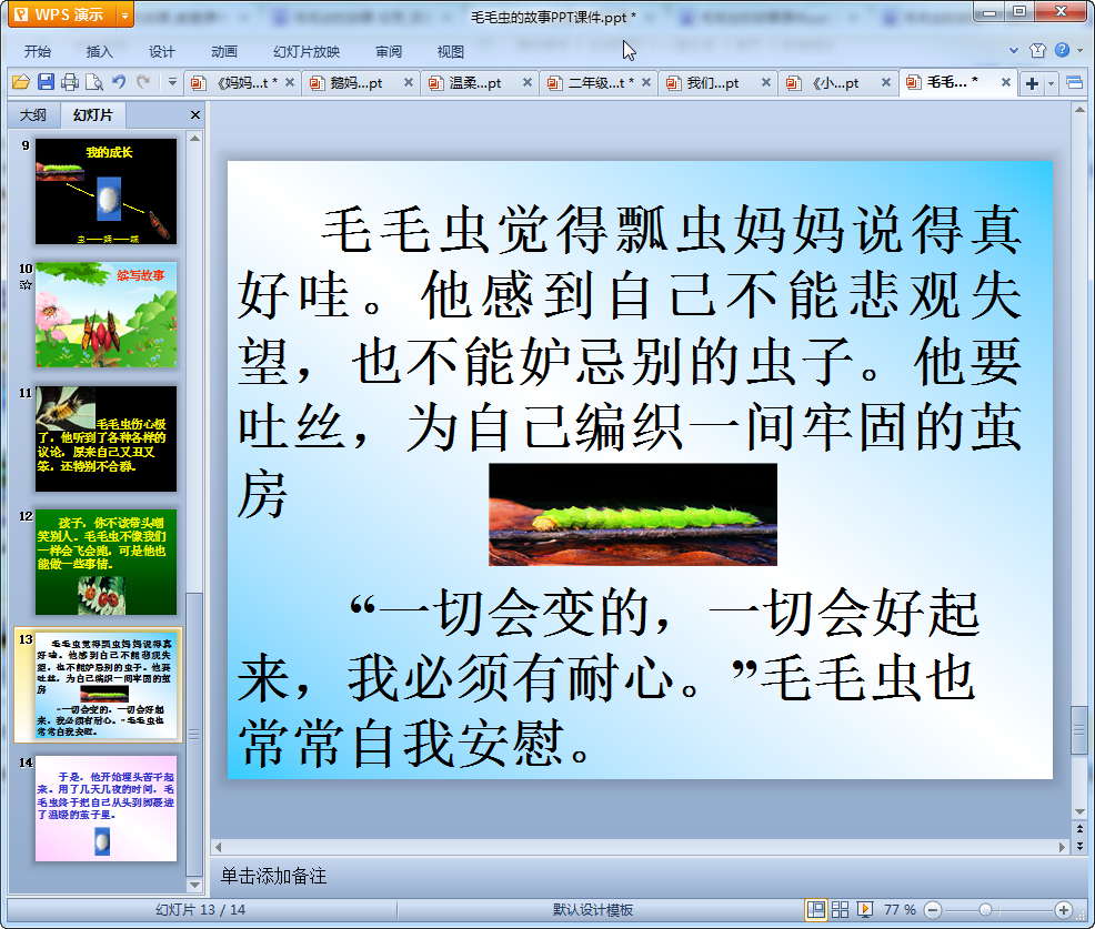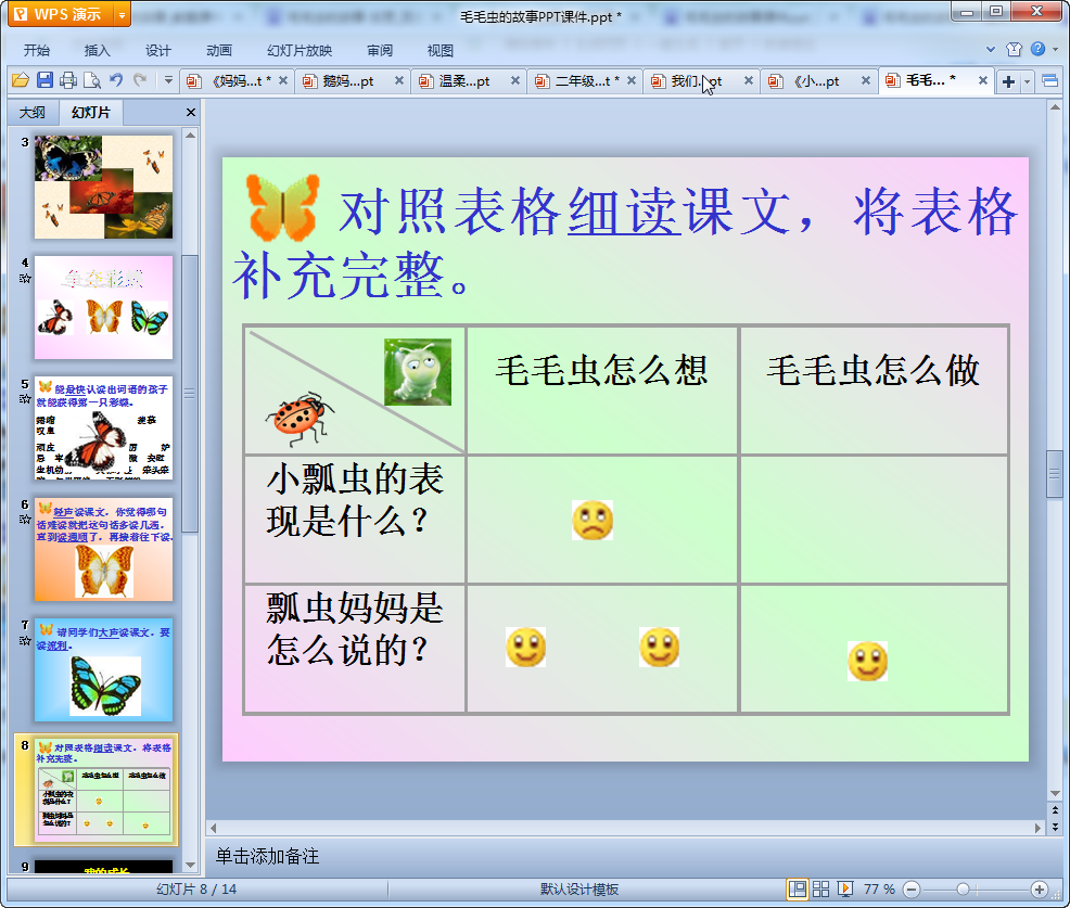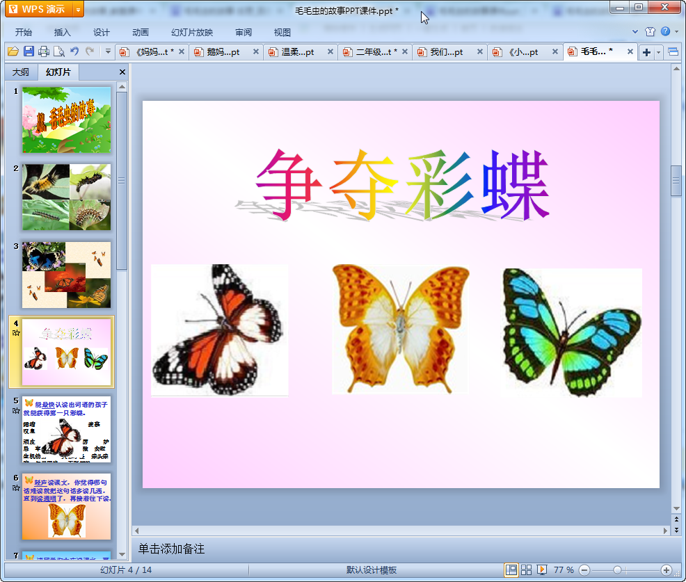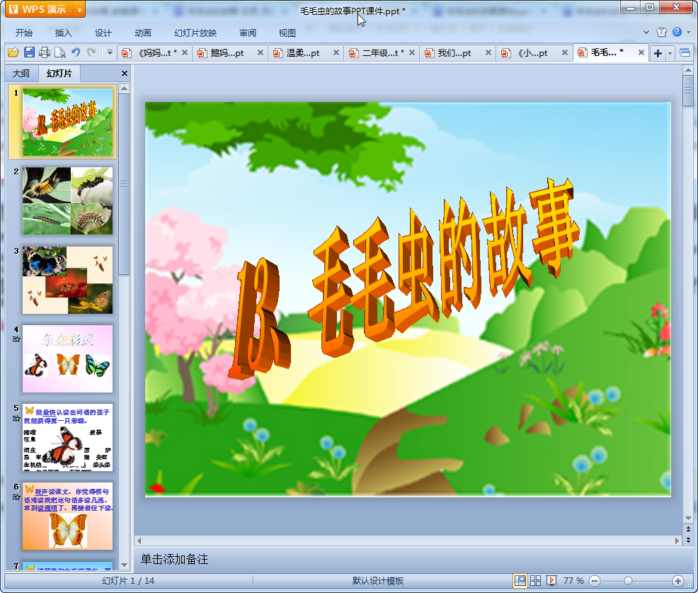 这是一篇小学二年级语文毛毛虫的故事教学课件,精美的制作加上漂亮的蝴蝶图片深受学生们的喜欢,擅长ppt教学的老师们千万不要错过的一篇教学课件,有兴趣的快来下载这篇共14页的毛毛虫的故事课件吧!