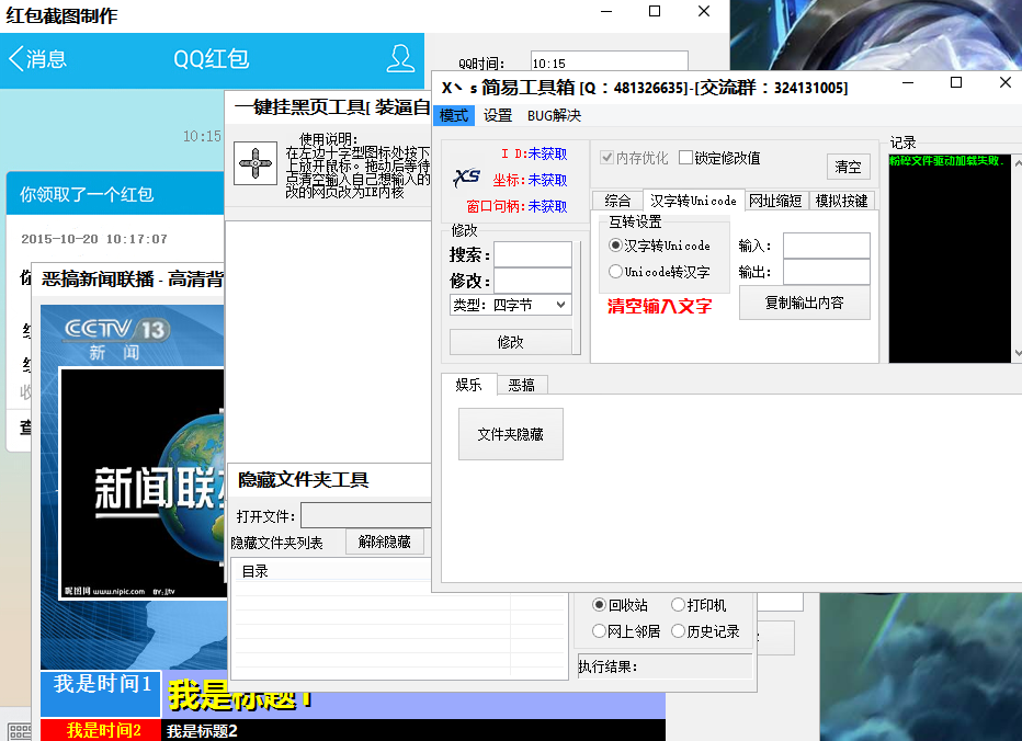 鼠标键盘录制模拟、红包领取生成、恶搞新闻、一键挂黑页(装逼)、文件夹隐藏