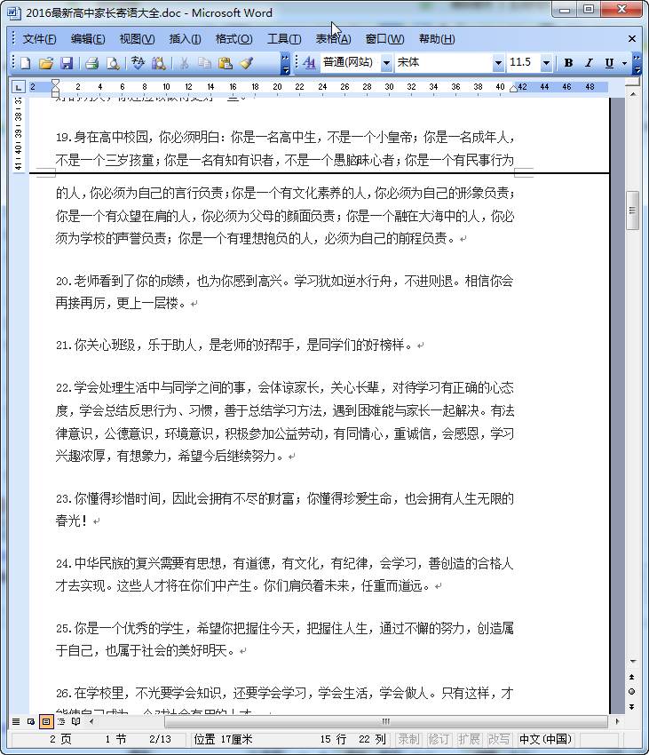 19.身在高中校园,你必须明白:你是一名高中生,不是一个小皇帝;你是一名成年人,不是一个三岁孩童;你是一名有知有识者,不是一个愚脑昧心者;你是一个有民事行为的人,你必须为自己的言行负责;你是一个有文化素养的人,你必须为自己的形象负责;你是一个有众望在肩的人,你必须为父母的颜面负责;你是一个融在大海中的人,你必须为学校的声誉负责;你是一个有理想抱负的人,必须为自己的前程负责。