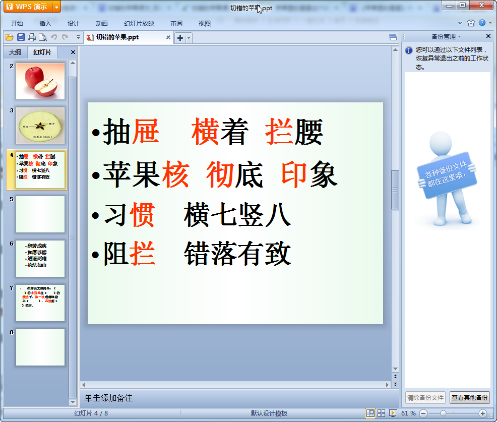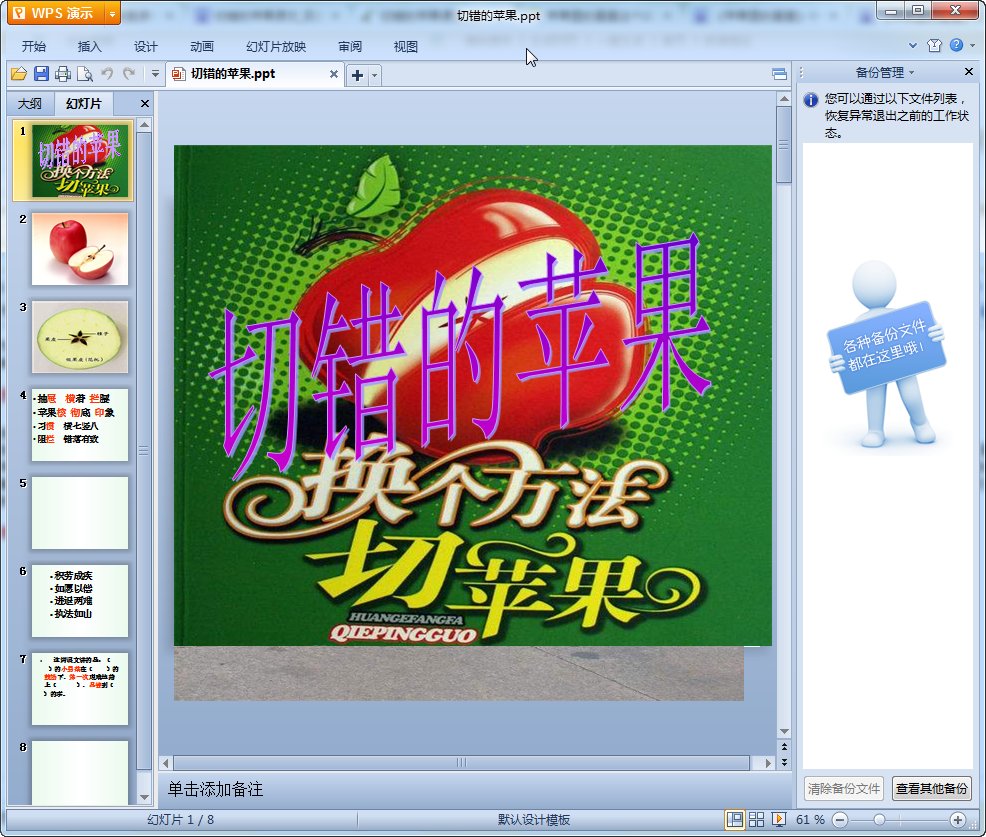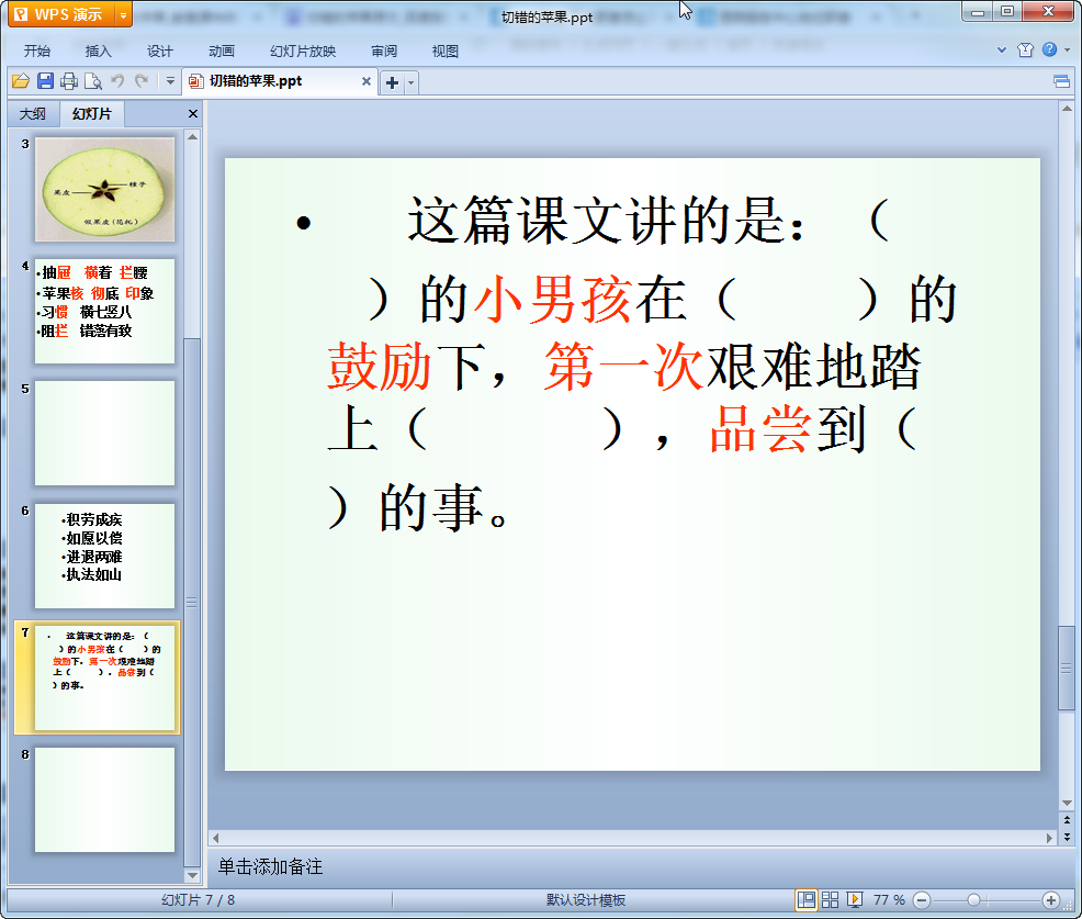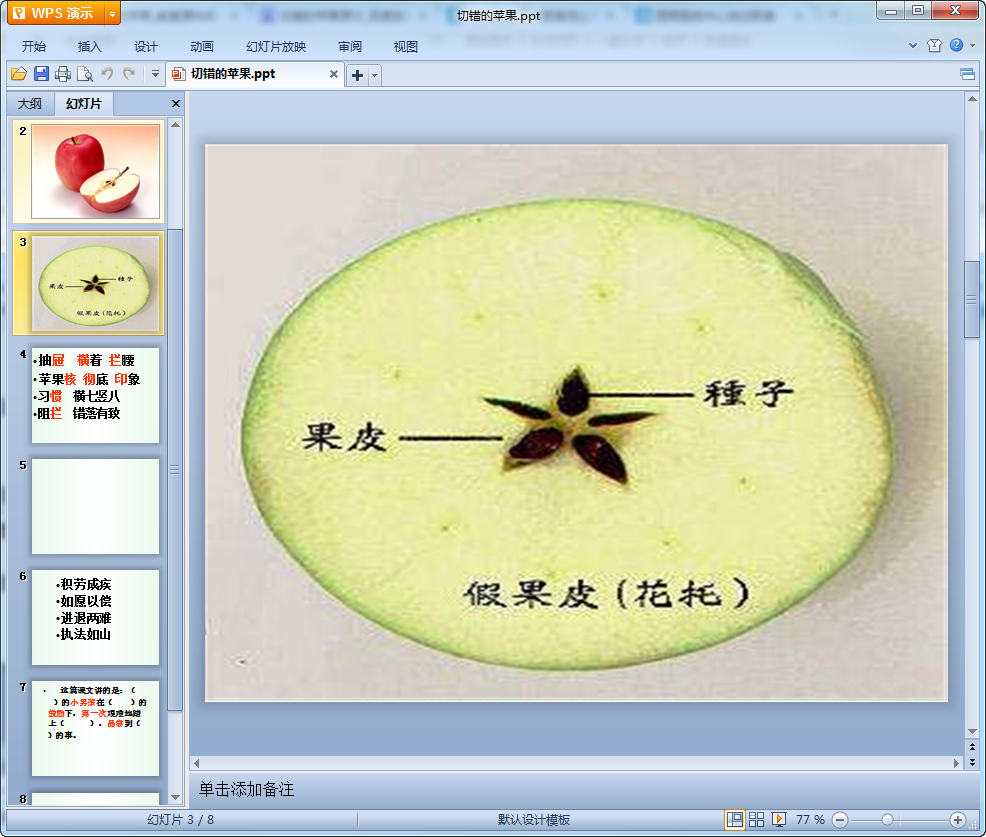这是我们东坡下载为大家整理的一份切错的苹果教学课件,课件制作十分精美对课文的内容讲解的十分详细,课文寓意深刻对孩子们有很大的帮助,有需要该课件的老师们可以来我们这里免费的下载使用!
