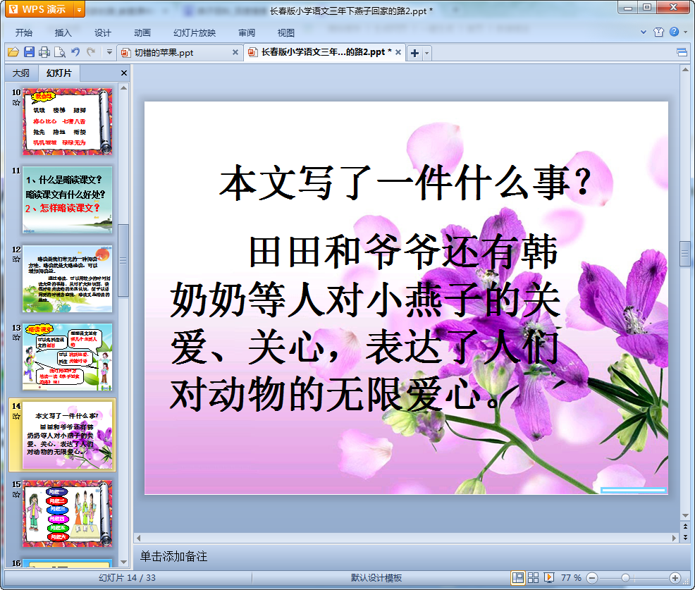 田田和爷爷还有韩奶奶等人对小燕子的关爱、关心,表达了人们对动物的无限爱心。