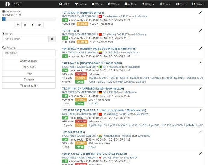 IVRE包括运行Nmap工具对目标像一个网络或一个地址范围,整个国家,一个特定的作为,或者完整的IPv4地址空间连接。