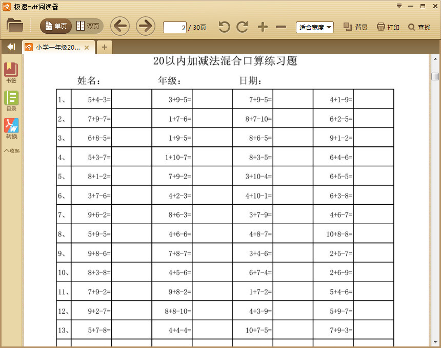 小学一年级20以内加减法混合运算3000题,完全免费,而且是a4打印版的,每一页都有100题,总共有30页,也就是3000题,在寒假将要到来的时刻,可以布置孩子们完成这些作业哦。