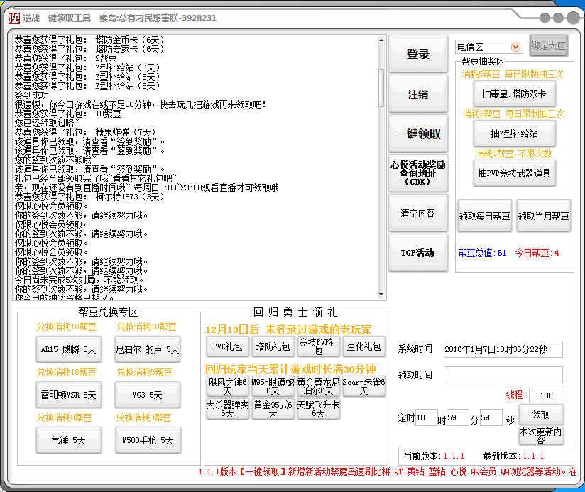 逆战一键领取工具可以帮你轻松领取nz帮豆、领取各种活动奖励。软件是要媲美“火线福利轻松领”的节奏。因为融入了帮豆兑换的功能,所以软件界面上的按钮比较多,不多废话,需要的下!
