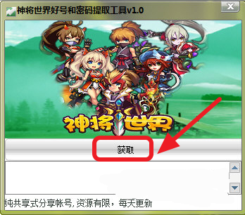 神将世界好号和密码提取工具,通过该工具,能够分享网友们提供的神将世界账号,让没有体验高级号的玩家们也能感受大神们的世界。让你们天天可以玩豪号,有需要的赶紧来下载使用吧。