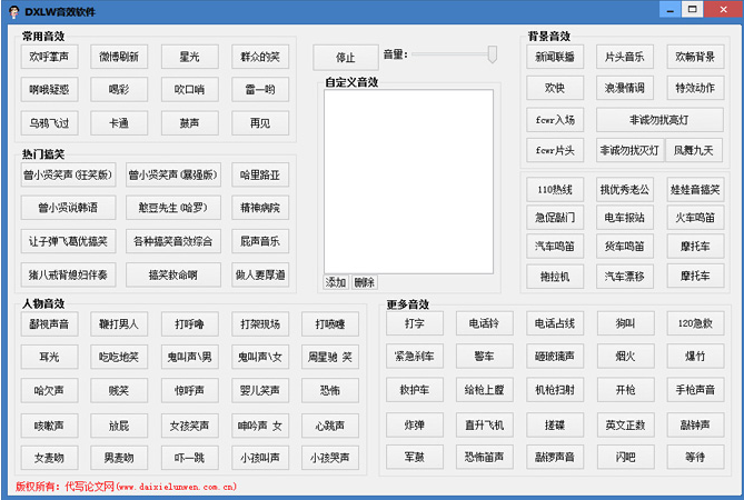 DXLW语音背景音效软件,不仅本身小巧玲珑,而且操作简单,支持搞笑音效、人物音效、背景音效等等、还可以自定义音效。包括的音效有:欢呼掌声、微博刷新、群众的笑、喝彩、吹口哨、鼓声、心跳声、火车鸣笛声等等,并且还可以任意调节音量大小和停止音效。