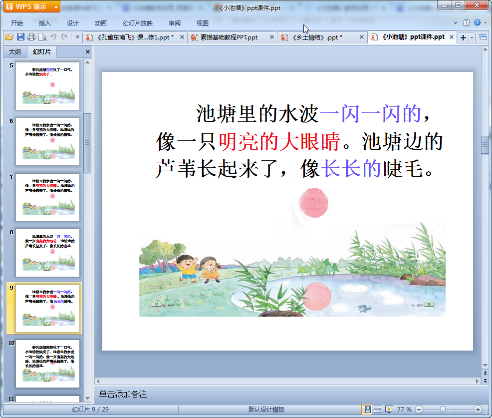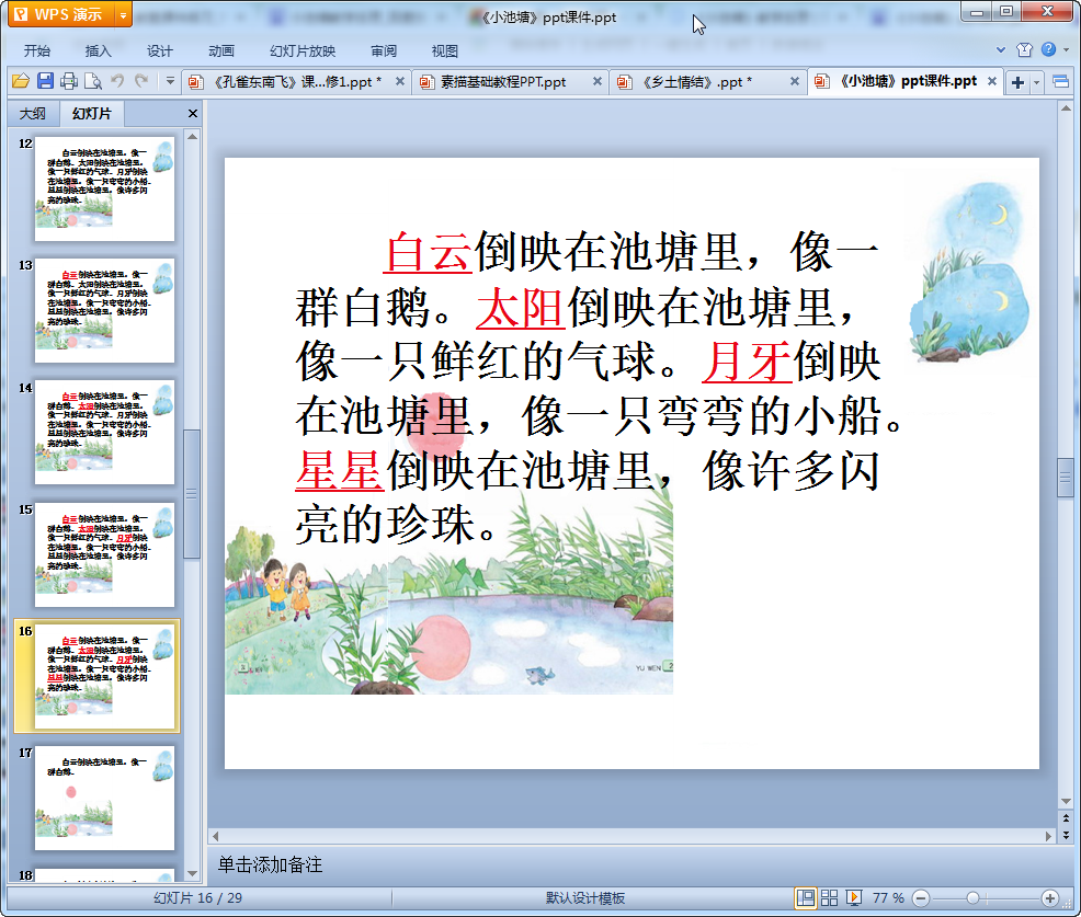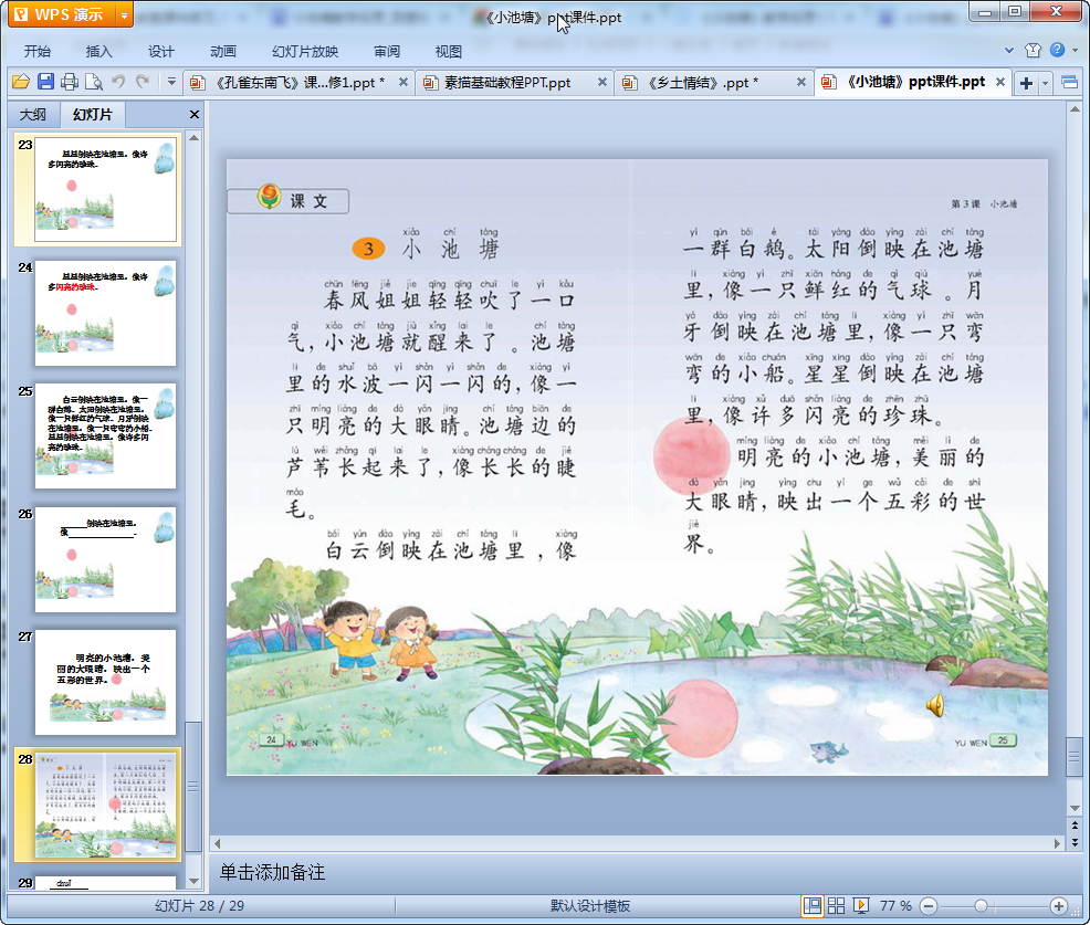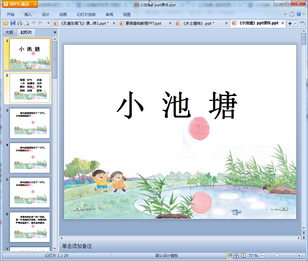 这是我们东坡下载整理的一篇小池塘课件ppt,课件共有29也制作比较精美对孩子们具有一定的吸引力加上完整的课文讲解,绝对是老师们的不二选择,有需要的同学们快来这里免费的下载使用吧!