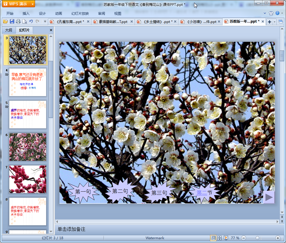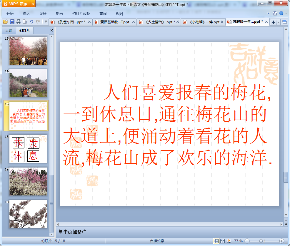 这是我们东坡下载为大家准备的一篇春到梅花山教学课件,课件制作精美大量的美化配图让整个课件更加的吸引人,对学生们的教学更加的有效率,有需要的老师们可以来我们东坡免费的下载使用!