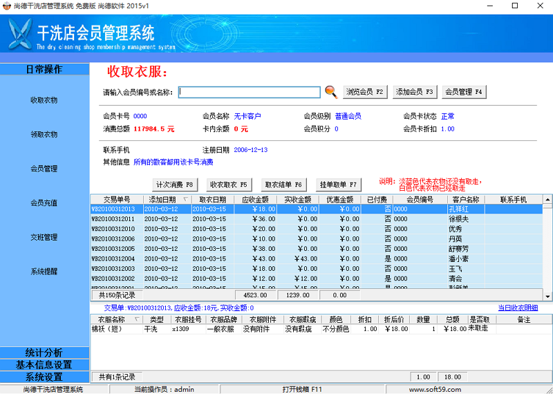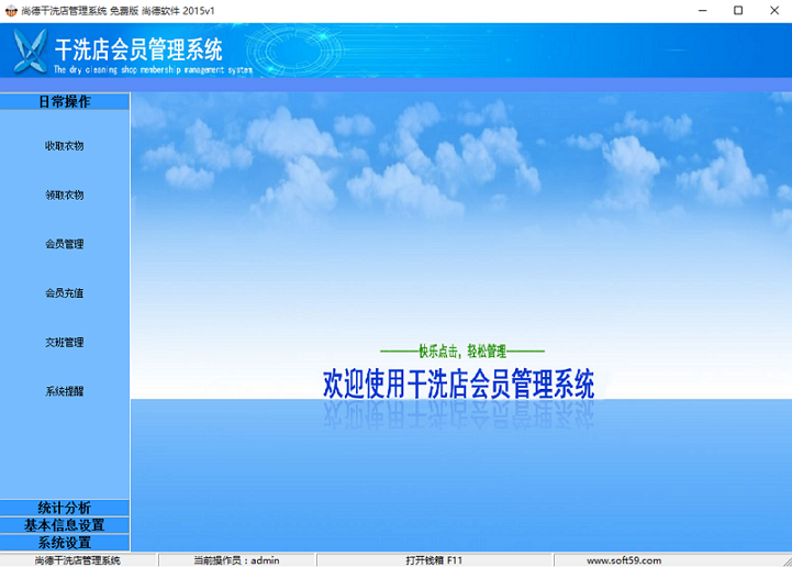 尚德干洗店管理系统,一款专业的洗衣店管理软件,它集前台收费收银系统,会员卡管理系统,财务报表系统等强大功能为一身,有需要的赶紧来下载使用吧。