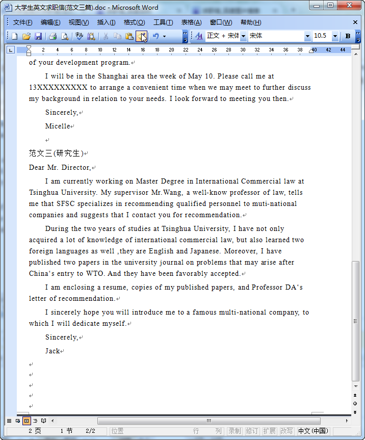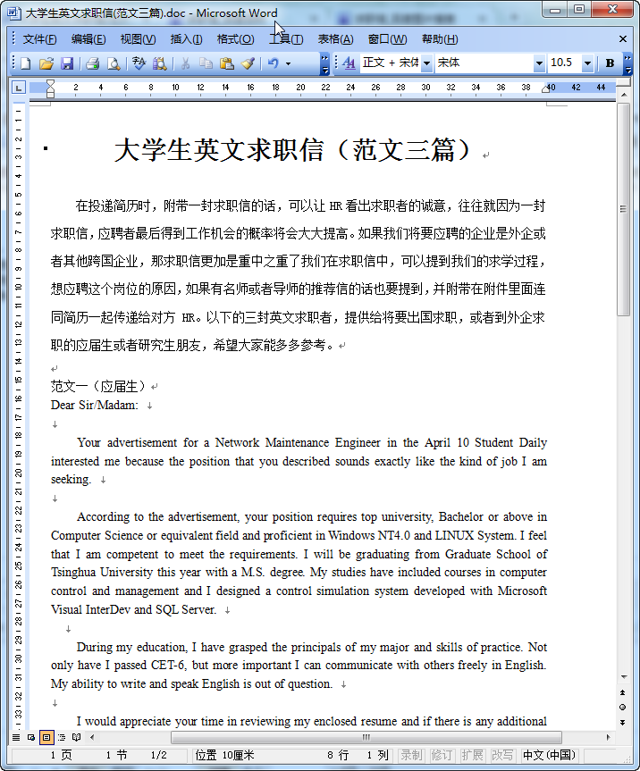 这是我们东坡下载为各位广大的学子们准备的一篇大学生英文求职信范文,内容比较丰富,应面试工作需求需要准备英文求职信的同学可以来看看我们的这篇精美的大学生英文求职信范文(共3篇),精美的英文求职信范文等着你!