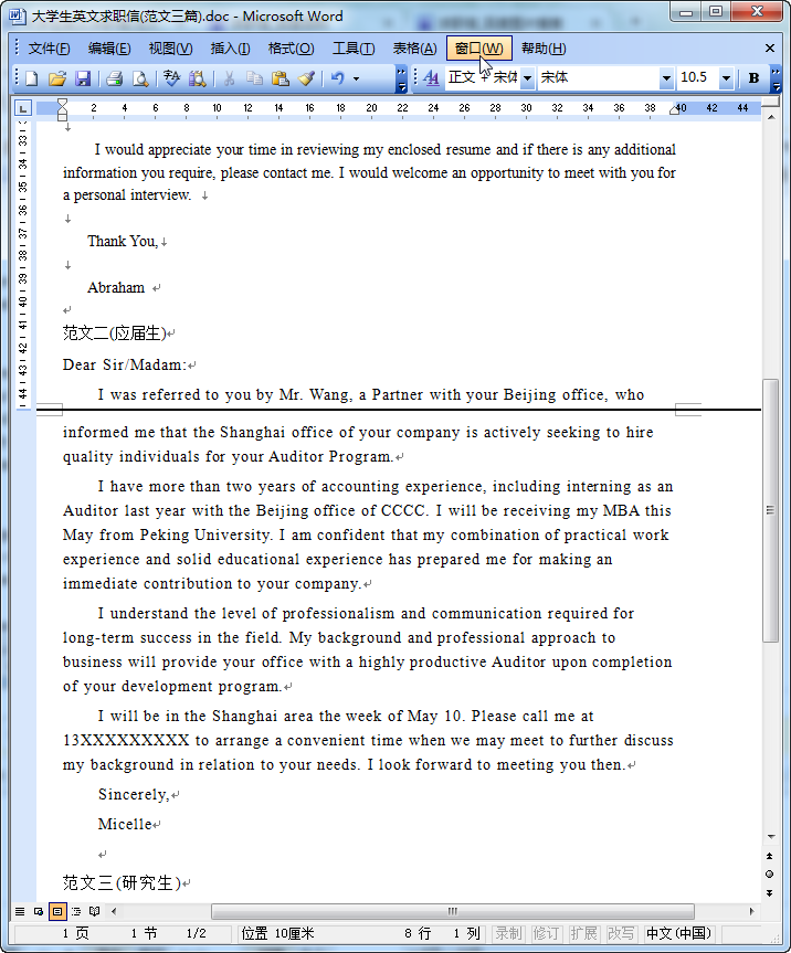 (3)从求职的时间看,有短期性求职信;中期性求职信;长期性求职信等。