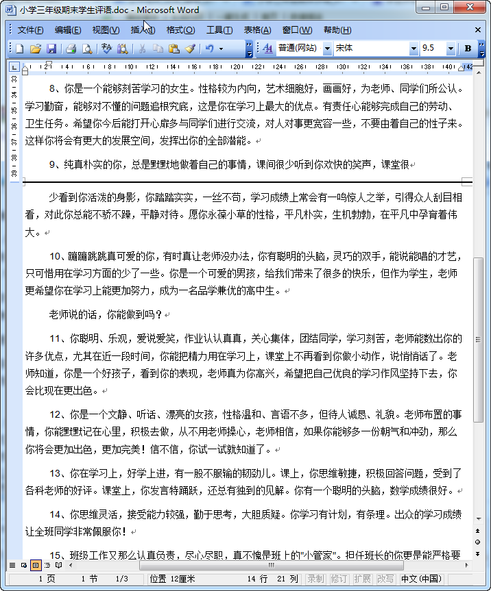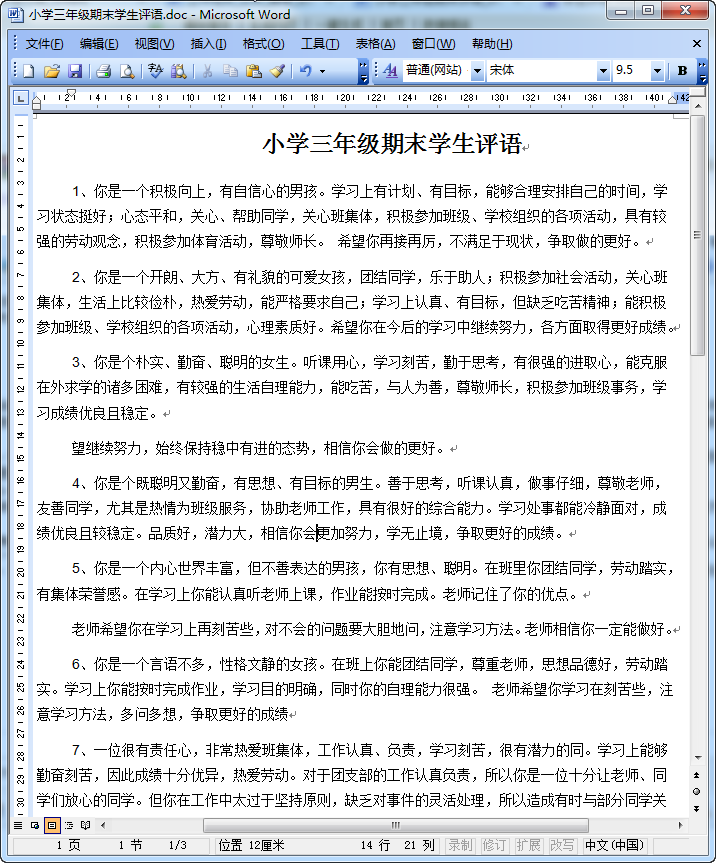 小学期末学生评语范文大全内容摘要