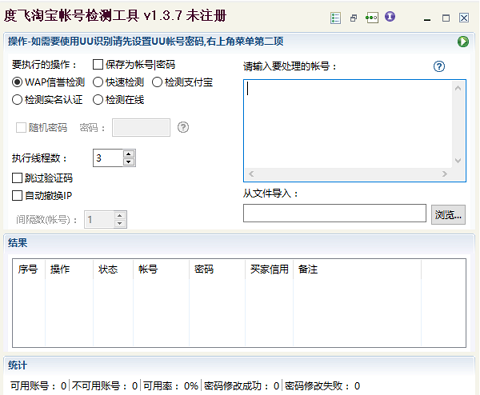 度飞淘宝账号检测工具可以进行帐号检测的类型:自动分类保存 被封的号/无信誉有用的号/有信誉的号,列出信誉点数,检测帐号是否在线,检测帐号是否实名认证,检测帐号是否激活支付宝 。