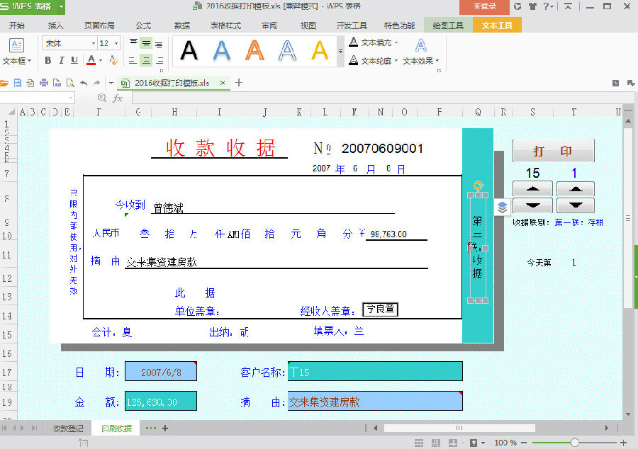 由于公司每天开收据的数量很大,这份2016收款收据打印模板帮你实现一个收据填开后打印的功能,有效保证收据的格式规范,要素明确等,非常的美观。