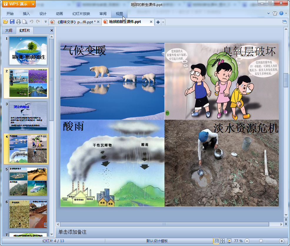 1、是的,地球是我们人类美丽的家园,它为地球上的生物提供着生存所必需的环境和资源,课前,我们都进行了前置性作业,收集了关于地球环境的资料,下面请小组代表介绍一下。