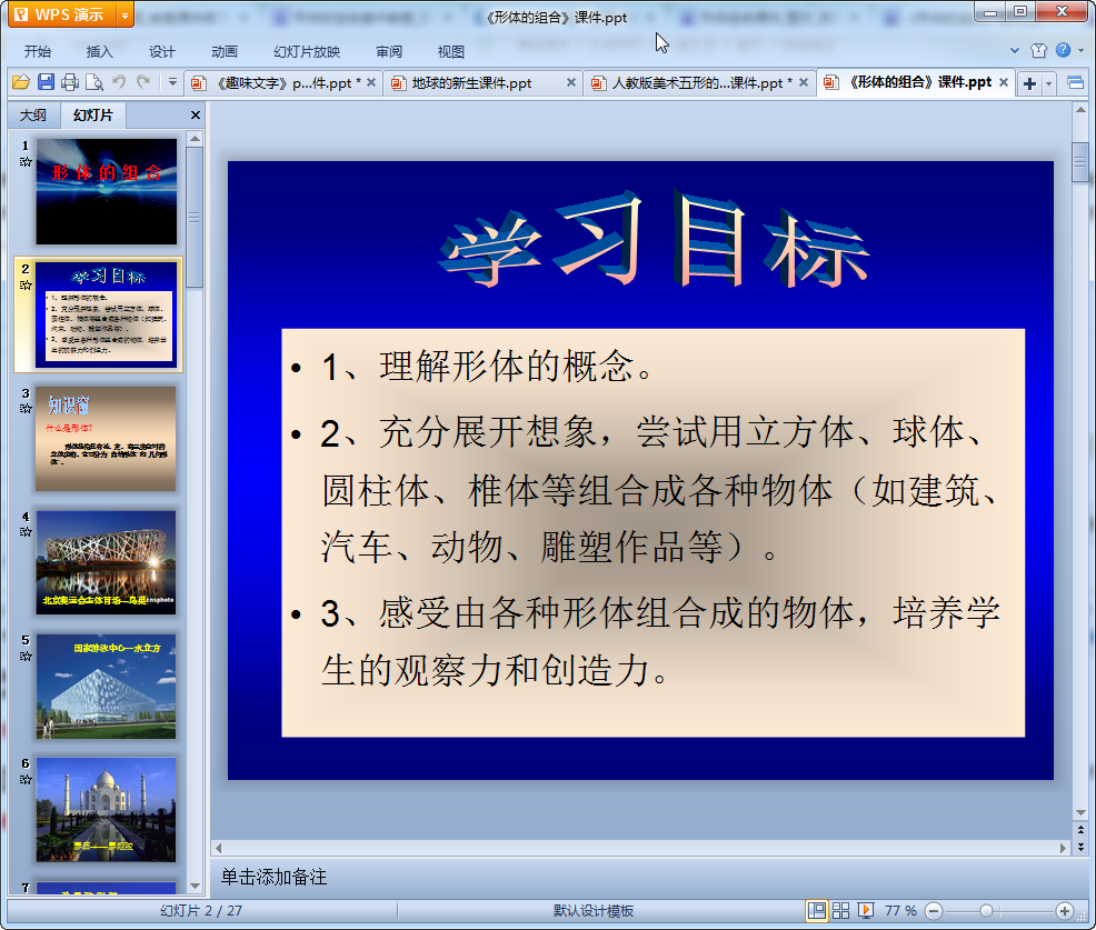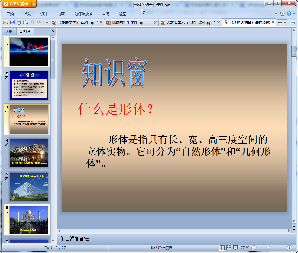 这是一篇形体的组合教学课件,是小学五年级下册的美术课文,在即将到来的新学期里大家都会用到的课件,有兴趣的老师们可以来我们这里收藏使用!有需要的时候可以来我们东坡直接下载免费使用!
