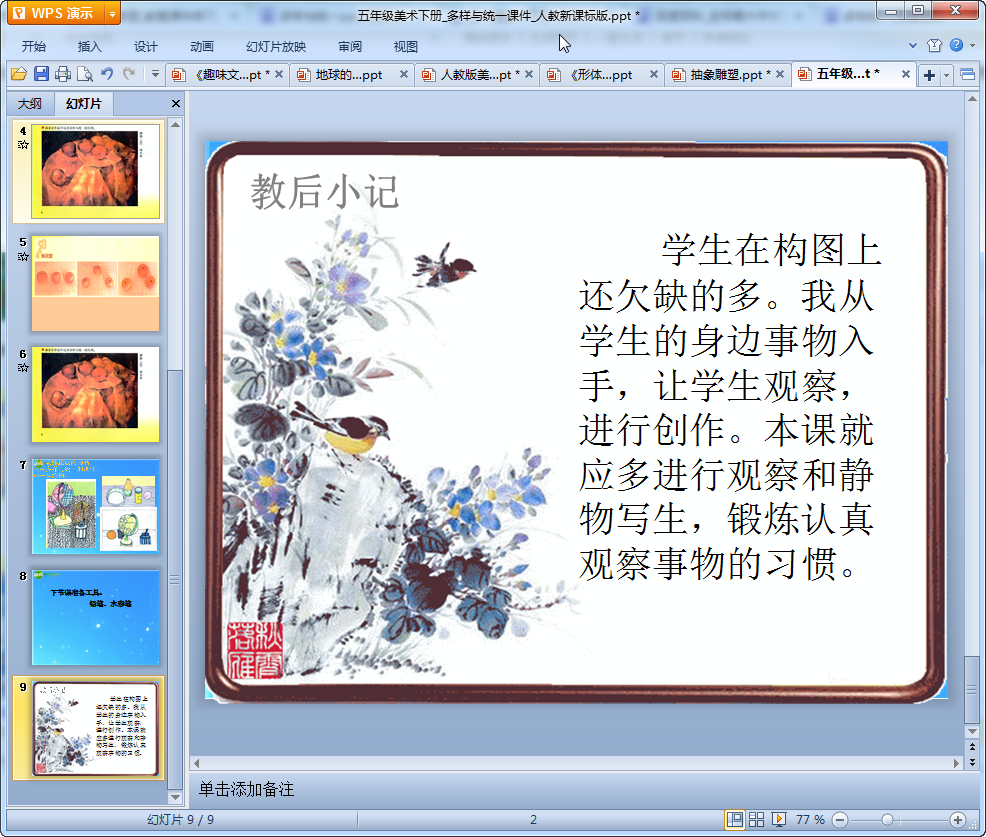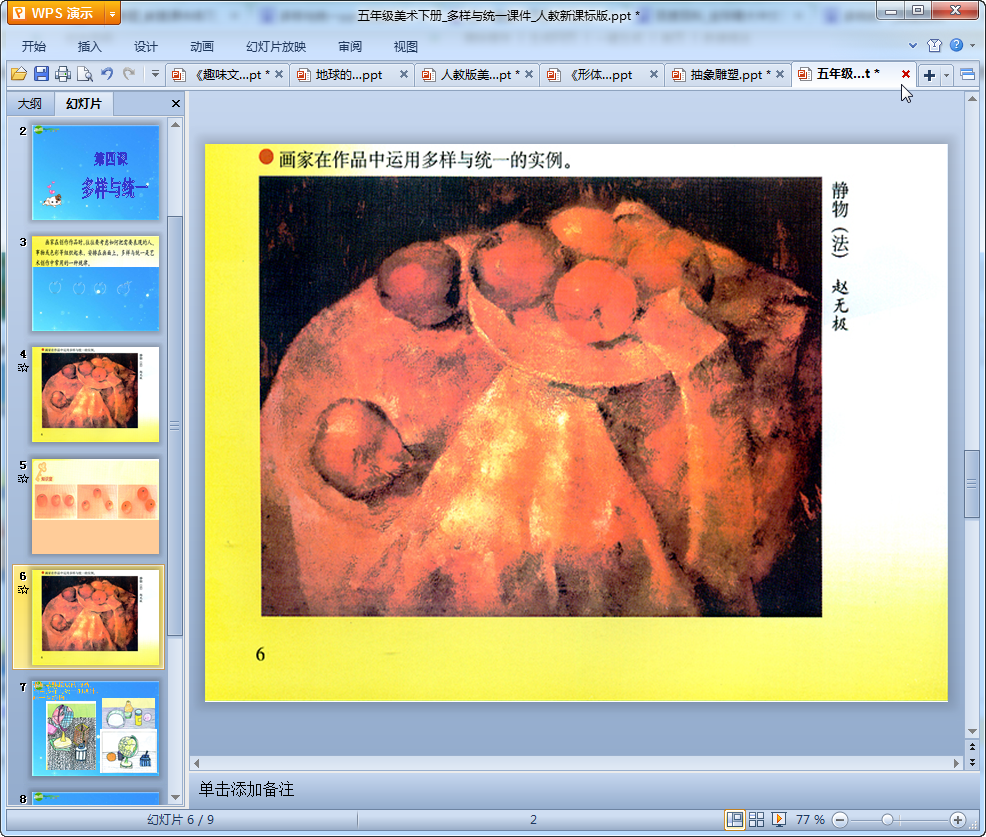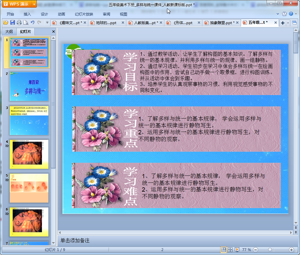 这里给大家带来的是一篇小学五年的美术课件多样与统一ppt,课件共有9页内容制作精美对课本中的知识点讲解清楚,非常不错的教学课件,有需要的同学可以来我们这里免费的下载使用!