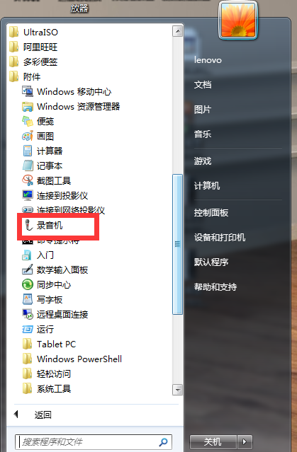 4.单击附件文件夹,弹出如下列表,在列表中找到 录音机 :