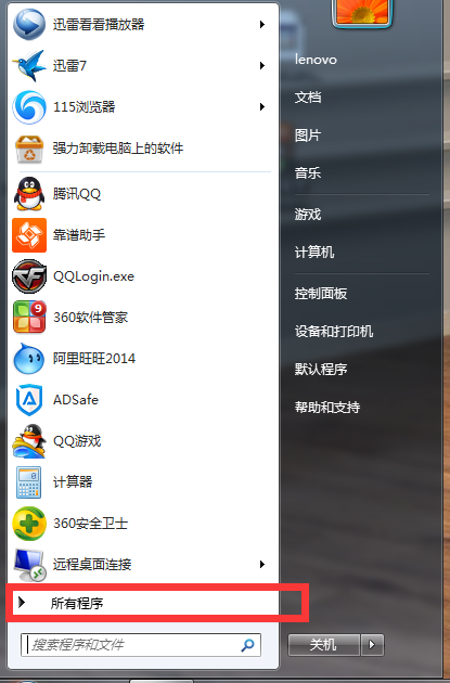 2、单击开始按钮之后,弹出如下界面,找到所有程序: