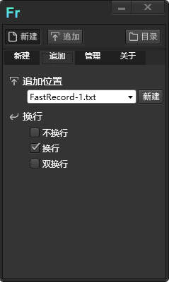 复制文本生成TXT文件(FastRecord),它能够将复制的文本自动生成TXT文本文件,让你不用手动转换了,追加位置还可设置换行、不换行、双换行模式等功能,有需要的赶紧来下载使用吧。
