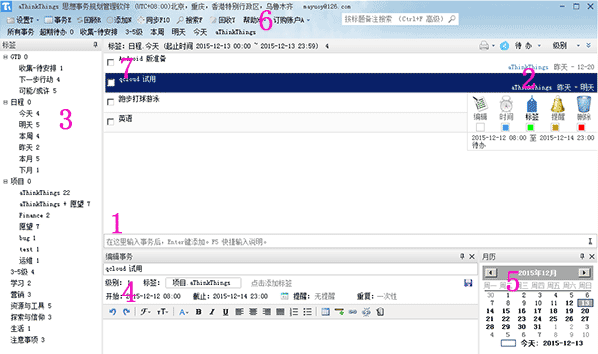 (1) 处是首选录入方式:快捷输入框。在此输入事务/想法,还可快捷地设置标签、时间、级别等。回车键添加,按F5有快捷输入帮助。 快捷录入时,(4) 处的事务属性窗口,也可用于设置事务的标签、级别、时间、提醒、循环及备注(此属性窗口,可在顶部‘设置’菜单处设置是否显示)