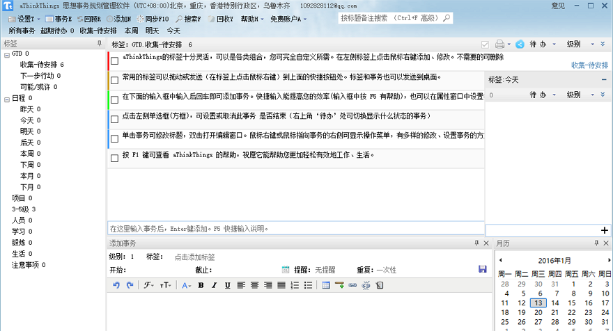 使用aThinkThings 首先需在aThinkThings网站注册一个用户(用于多设备同步数据)。日常使用时如不需同步,可以不联网使用。软件界面如下: