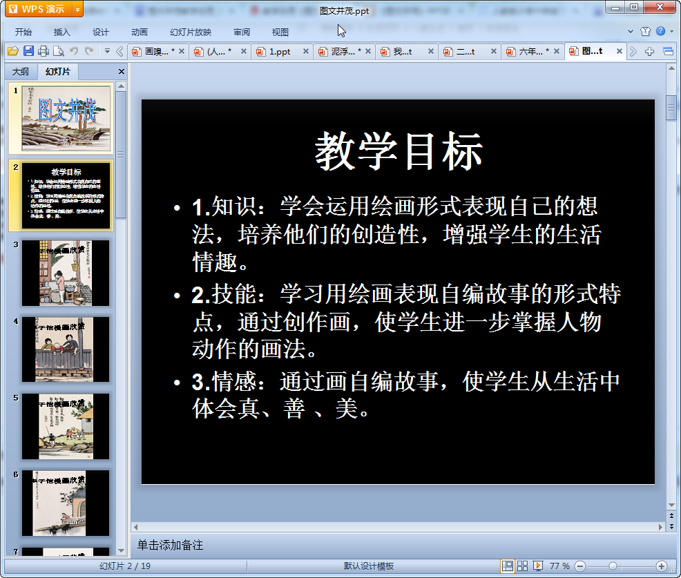 1、导入环节再简短些,在学法指导、尤其是卡通连环画创作方面的方法,如人物表情内心的刻画,演示示范再画一个侧面的卡通形象,再有效果线的运用再作个示范就更完美了。