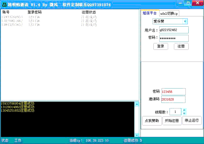 然后我们打开刷豆软件,填写自己的注册码,接码平台帐号密码,就可以开始刷豆了。