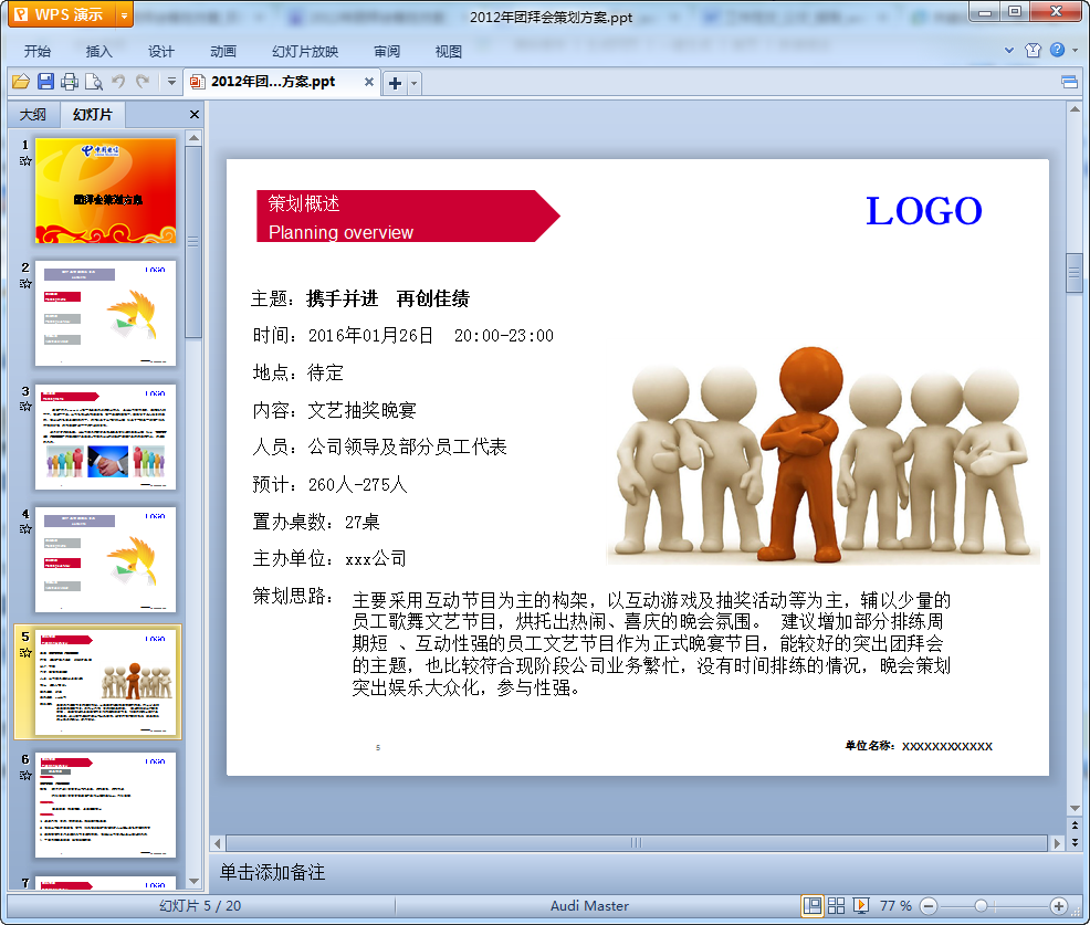 临近春节了,这里我们小编为大家精细准备了这篇2016团拜会策划方案ppt模板,精美的团拜会策划方案ppt绝对是大家所需要的,整篇ppt共有20页精美的制作大家一定会喜欢的,有需要的快来我们东坡免费的下载使用吧!