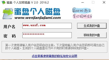 蜜盘文件夹加密专家,蜜盘个人磁盘是在您电脑上D盘创建的一块加密磁盘区域,您可将需要保护的私密文件存放在 蜜盘文件夹加密盘中。每个用户一个账号,只有当您使用自己的账号和密码登录后 电脑会多出个M:盘,你可以任意操作,不用的时候,可以随时移除自己的文件夹加密密盘,甚至您忘记移除,重启电脑后也不会自动出现个人文件夹磁盘。软件支持无限多账号,您可以为每个人创建一个账号,自己也可以根据文件分类不同创建不同账号,方便管理。