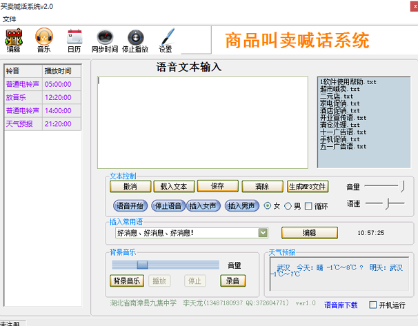 超市售卖喊话系统,一款可以帮你在超市里自动帮助你喊话的系统,让大家都知道今天的最新消息,可以帮助你更好的营销,有需要的赶紧来下载使用吧。