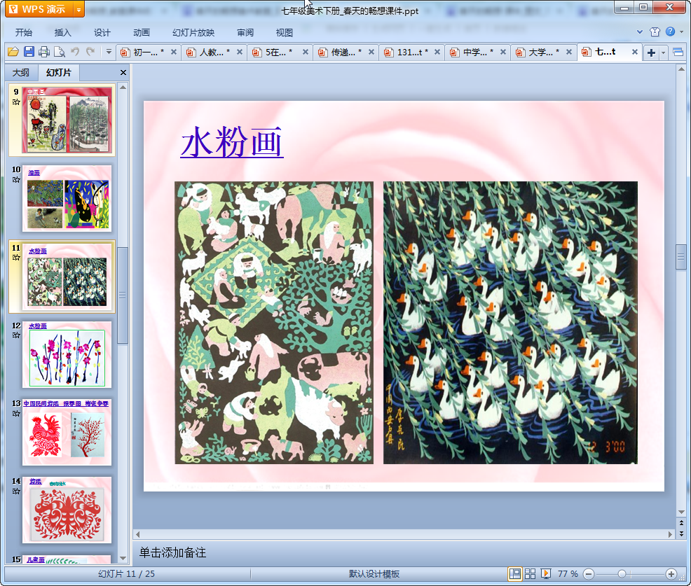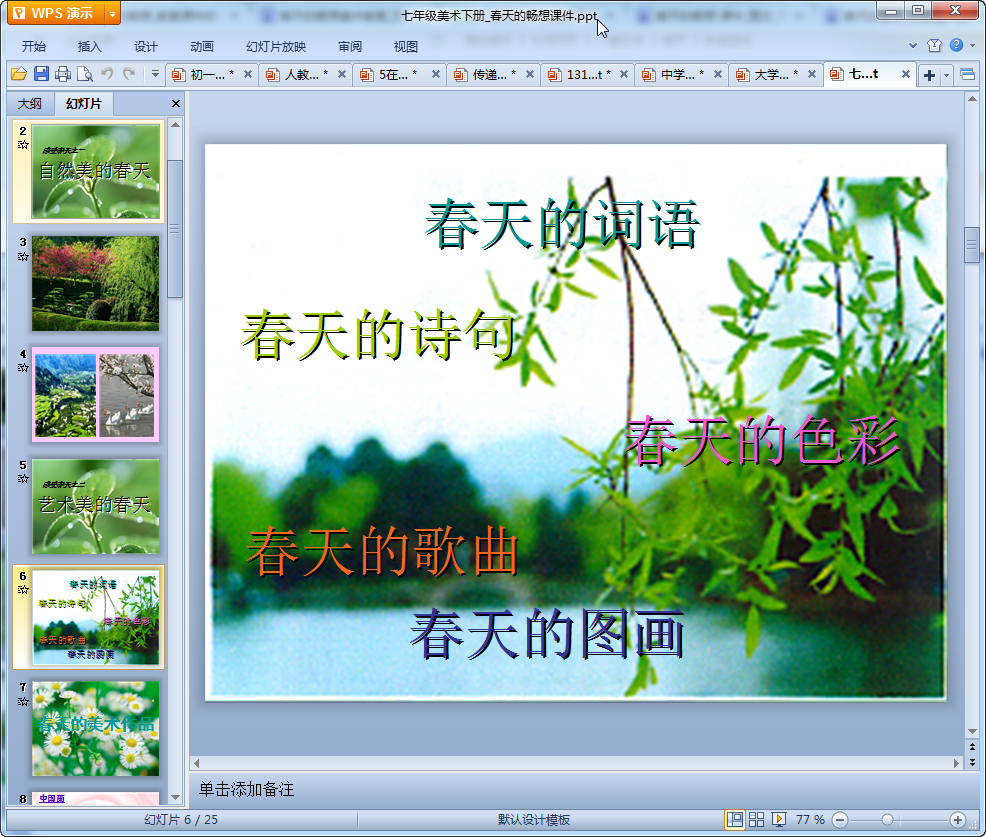 屏幕展示多幅自然界的春天图片和表现春天的美术作品对照比较,进一步认识自然美与艺术美中的春天。(背景音乐《春江花月夜》)。