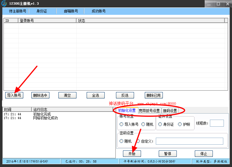 导入你需要注册的账号,设置相关拨号、打码、接码等信息,点击【开始】按钮即可成功实现13206的批量注册