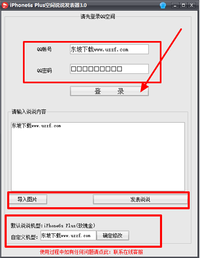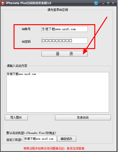 iPhone6s Plus空间说说发表器是一个娱乐装逼的小工具,平常我们使用手机发QQ空间说说的时候,内容下面会显示手机的型号,使用该软件发说说,能让你的说说内容下面显示iPhone6等还可以自己设置机型哦!简单易用,非常有趣。