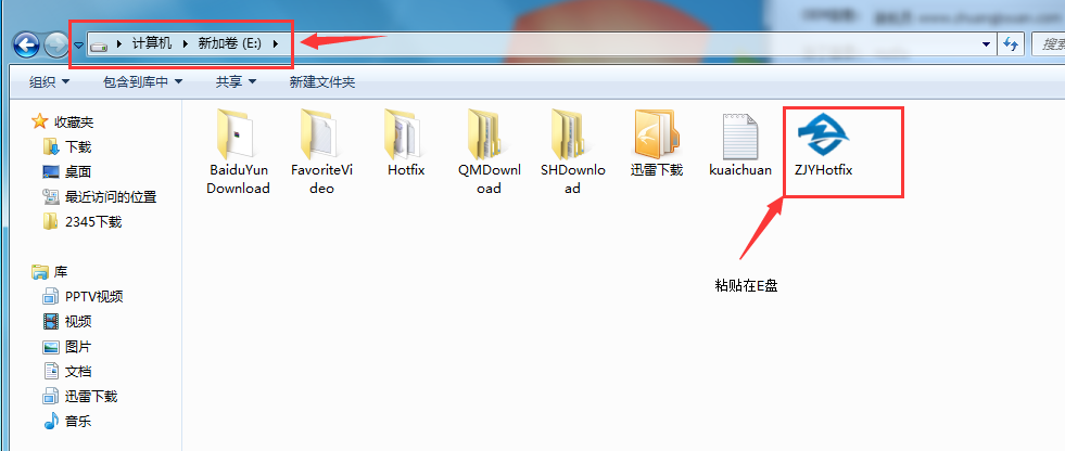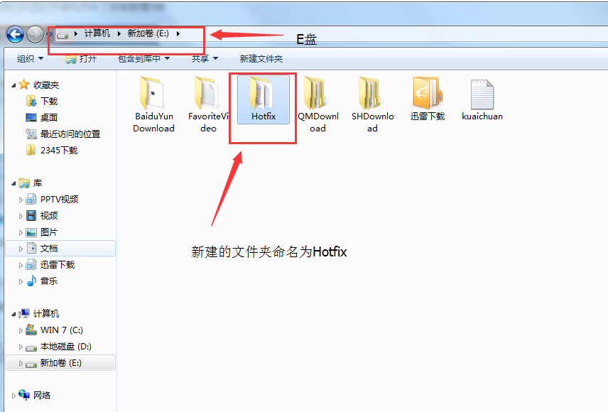 3、我们首先在计算机的任意盘符(如:D盘、E盘、F盘等,小编创建在E盘)内创建一个补丁目录文件夹名为:Hotfix;