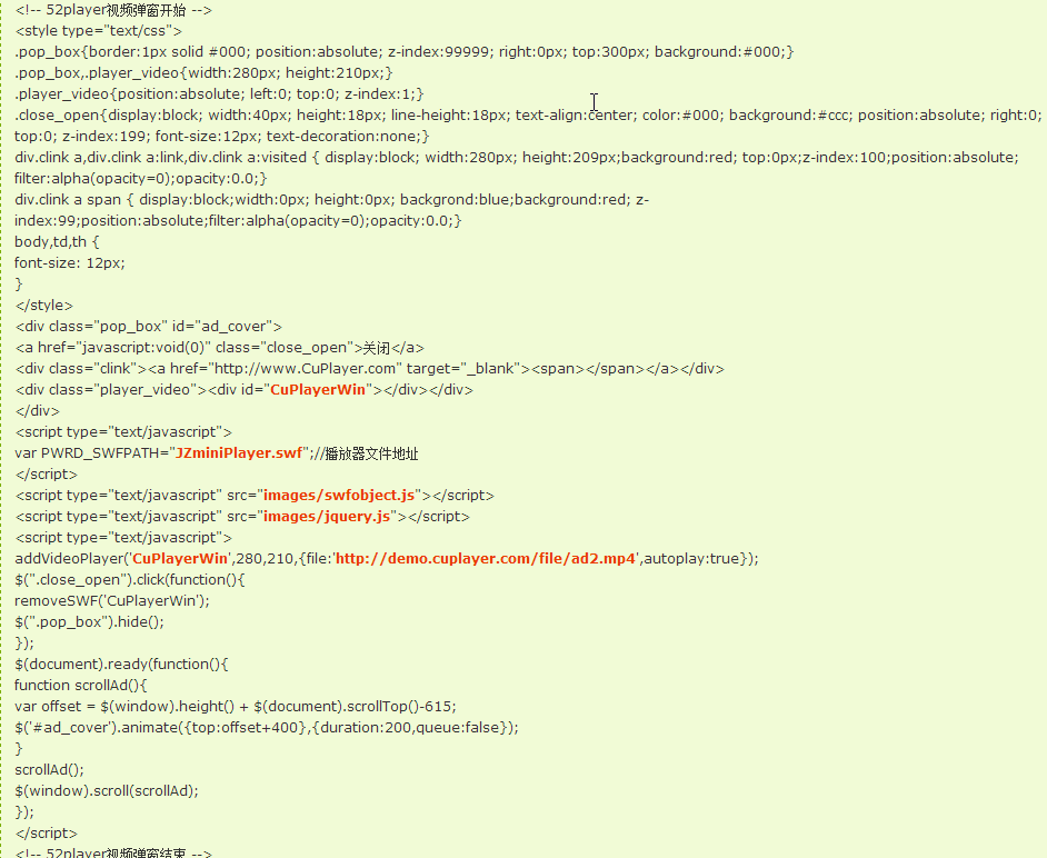 addVideoPlayer('CuPlayerWin',280,210,{file:'http://demo.cuplayer.com/file/ad2.mp4',autoplay:true})