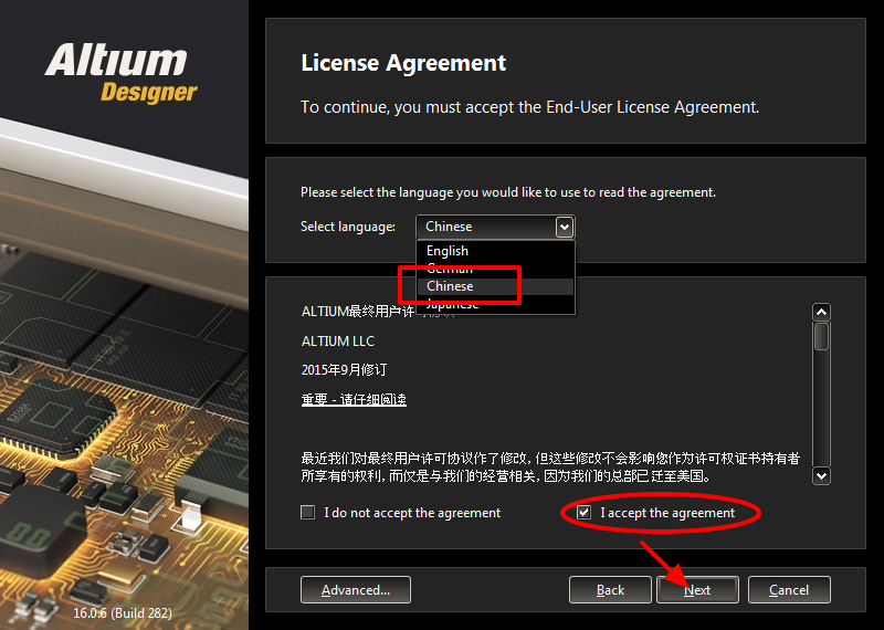 选择【Chinese】,勾选“I accept the agreement”,仍然点击【Next】