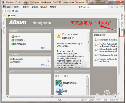 打开Altium Designer,留意右边侧边栏的”库“,单击: