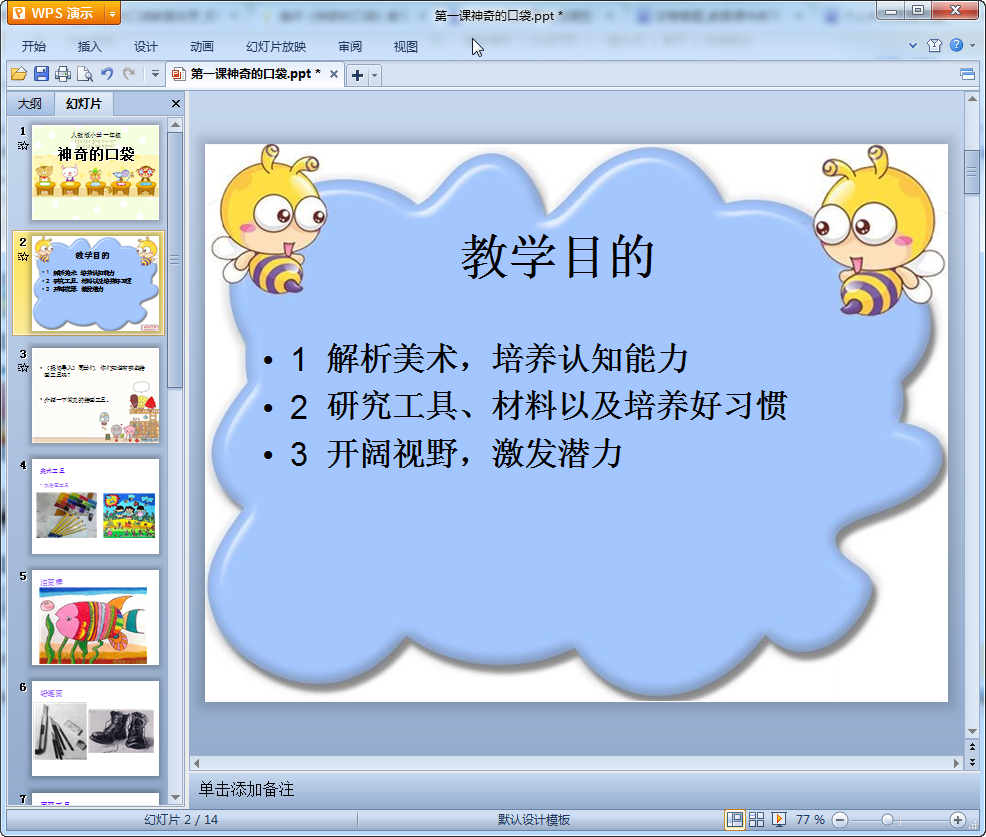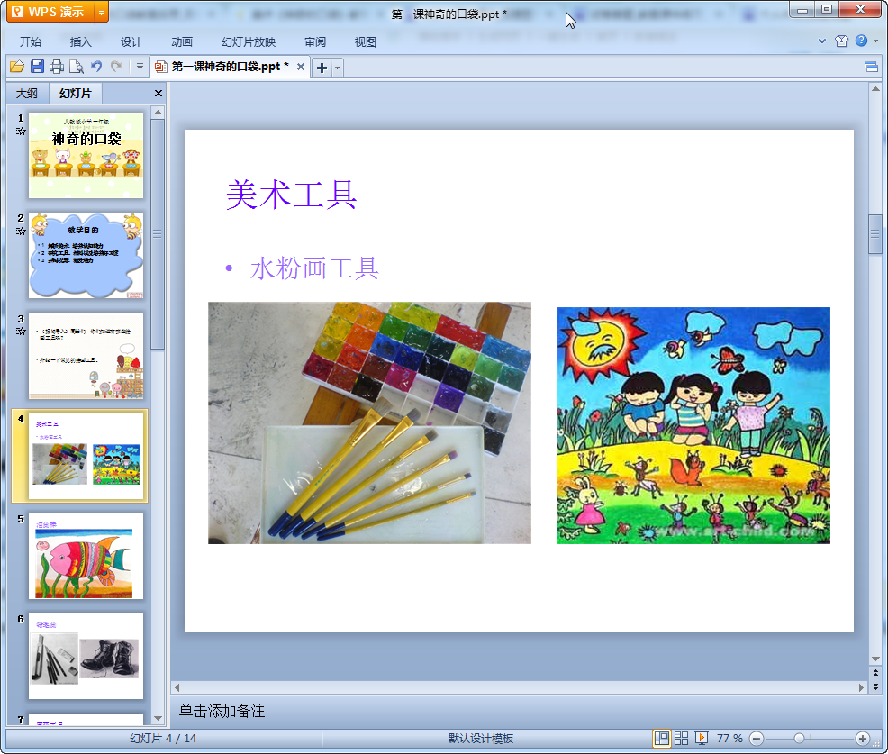 作为义务教育课程标准教科书一年级第一册《神奇的口袋》第一课,重点是让学生充分的认识美术工具,并形成良好使用美术工具的习惯。