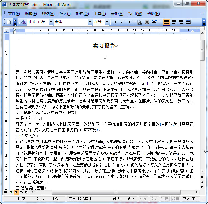 第一次参加实习,我明白学生实习是引导我们学生走出校门,走向社会,接触社会,了解社会,投身到社会的良好形式;是培养锻炼才干的好渠道;是提升思想,修身养性,树立服务社会的思想的有效途径。通过参加实习,有助于我们在校中学生更新观念,吸收新的思想与知识。近1个月的实习,一晃而过,却让我从中领悟到了很多的东西,而这些东西将让我终生受用。这次实习加深了我与社会各阶层人的感情,拉近了我与社会的距离,也让自己在社会实践中开拓了视野,增长了才干,进一步明确了我们青年学生的成材之路与肩负的历史使命。社会才是学习和受教育的大课堂,在那片广阔的天地里,我们的人生价值得到了体现,为将来更加激烈的竞争打下了更为坚实的基础。