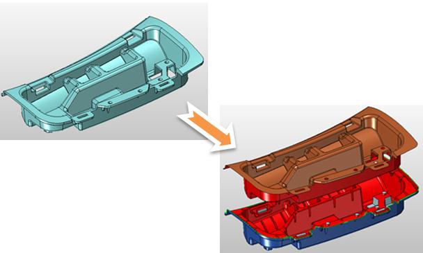 根据产品分析结果自动判断,自动区分型芯、型腔面,并可自定义分型面,灵活区分型芯、型腔面,简化设计师操作工序