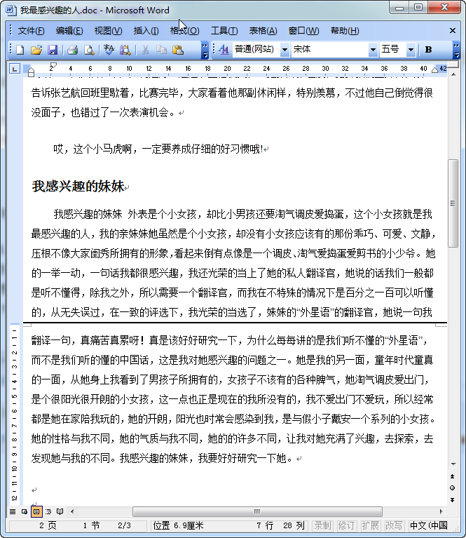 我感兴趣的妹妹 外表是个小女孩,却比小男孩还要淘气调皮爱捣蛋,这个小女孩就是我最感兴趣的人,我的亲妹妹她虽然是个小女孩,却没有小女孩应该有的那份乖巧、可爱、文静,压根不像大家闺秀所拥有的形象,看起来倒有点像是一个调皮、淘气爱捣蛋爱剪书的小少爷。 她的一举一动,一句话我都很感兴趣,我还光荣的当上了她的私人翻译官,她说的话我们一般都是听不懂得,除我之外,所以需要一个翻译官,而我在不特殊的情况下是百分之一百可以听懂的,从无失误过,在一致的评选下,我光荣的当选了,妹妹的“外星语”的翻译官,她说一句我翻译一句,真痛苦真累呀!真是该好好研究一下,为什么每每讲的是我们听不懂的“外星语”,而不是我们听的懂的中国话,这是我对她感兴趣的问题之一。