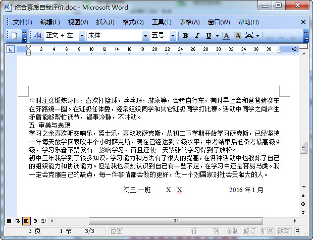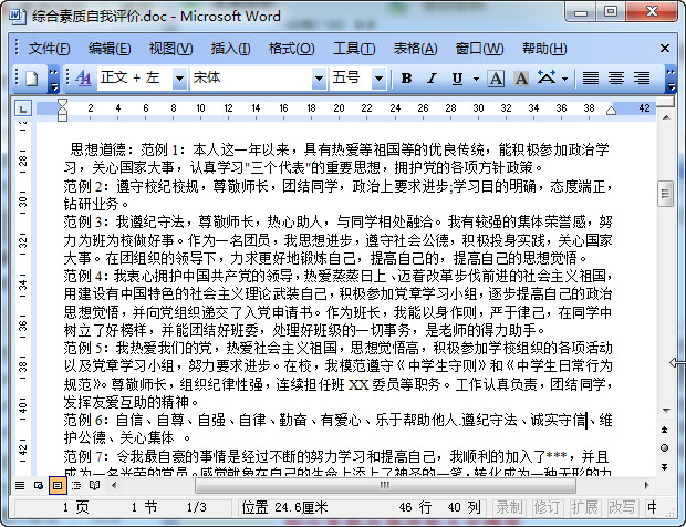 范例3:我遵纪守法,尊敬师长,热心助人,与同学相处融洽。我有较强的集体荣誉感,努力为班为校做好事。作为一名团员,我思想进步,遵守社会公德,积极投身实践,关心国家大事。在团组织的领导下,力求更好地锻炼自己,提高自己的,提高自己的思想觉悟。