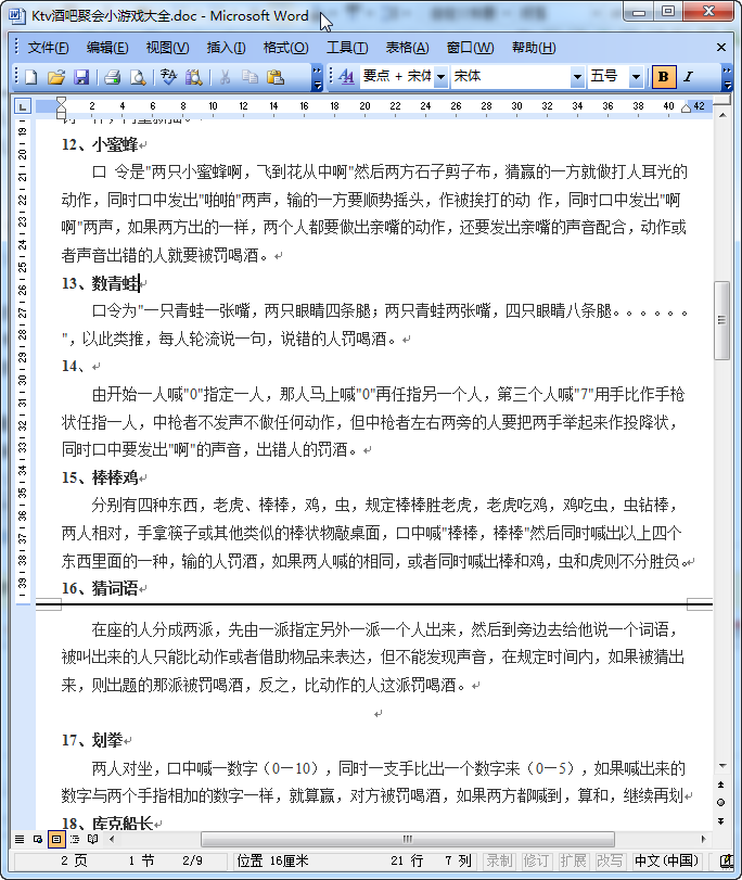 从古到今非常流行。游戏规则十分简单,两人相对同时伸手出指(双手能出的数字为0、5、10),口中报一数字(即二人出拳数字之和0、5、10、15、20),与双方伸指数目之和相同者胜,输的人罚喝酒,两人都喊中就继续。